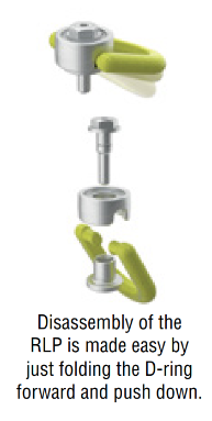 • Dismountable D-ring to enable assembly of roundsling, master link, or hook directly onto the lifting point.